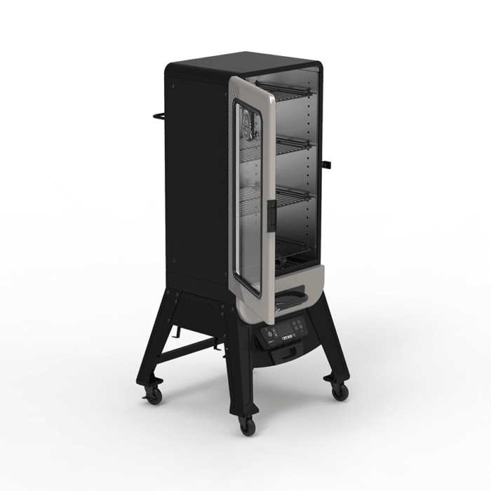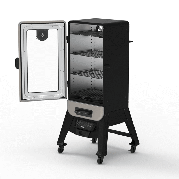 wheels, an easy-to-read digital controller, a meat probe, and a stunning